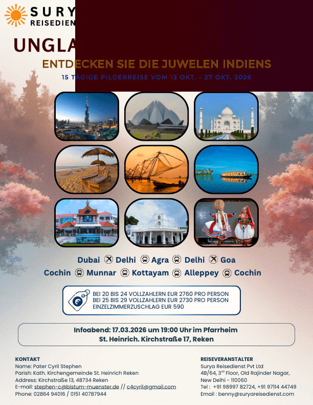 Wir fliegen nach Indien! Pater Cyril begleitet auch in diesem Jahr eine Gruppenrundreise nach Indien. Die 15-tägige Studien- und Erlebnisreise findet vom 13.10. bis 27.10.2026 statt. Für alle Interessierten gibt es einen Infoabend am Dienstag, 17. März 2026 um 19:00 Uhr im Pfarrheim St. Heinrich, Kirchstraße 17, Reken. Anmeldungen und weitere Informationen über: Pfarrbüro St. Heinrich E-Mail: stheinrich-reken@bistum-muenster.de Telefon: [...]