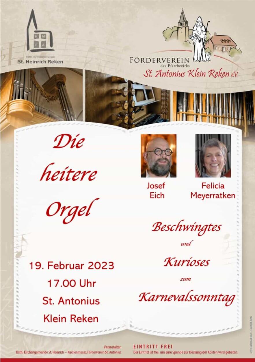 Am Karnevalssonntag laden der Förderverein und unsere Kirchengemeinde zu einem besonderen Orgelkonzert in die St. Antonius-Kirche ein. Felicia Meyerratken und Josef Eich lassen Beschwingtes und Kurioses auf unserer Muhleisen-Orgel erklingen. Beginn ist um 17.00 Uhr. Der Eintritt ist frei, um eine Spende wird gebeten.
