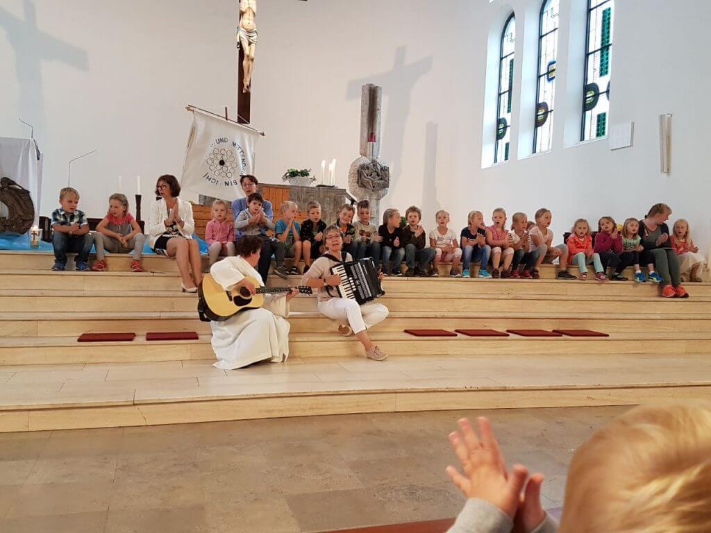 In den vergangenen beiden Wochen wurden die „Großen“ aus unseren Kindergärten entlassen. Die Entlassfeiern begannen stets mit einem Wortgottesdienst. „Mit Gott unterwegs“, das erfuhren die Kinder in St. Antonius. Sie wissen: Gott ist immer dabei, egal, wo sie unterwegs sind. Die Entlassfeier des Kindergartens St. Marien war in der Kapelle des Benediktushofs. „Gott, dein guter Hirte“ ist jemand, der weiß, was jeder Mensch braucht und der sich um uns sorgt und kümmert. Die Kinder in St. Elisabeth nannten ihre besonderen Talente, die Gott ihnen geschenkt hat. Und in St. Heinrich wurde das Segel neu ausgerichtet in Richtung Schule. Egal, wie stürmisch es manchmal um uns herum scheint, Jesus ist mit im Boot. Er kann dafür sorgen, dass es um uns herum wieder ruhig ist und wir sicher durchs Leben schippern.