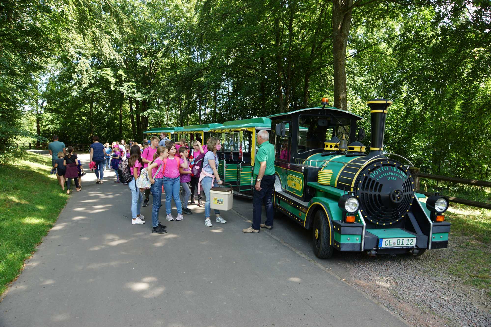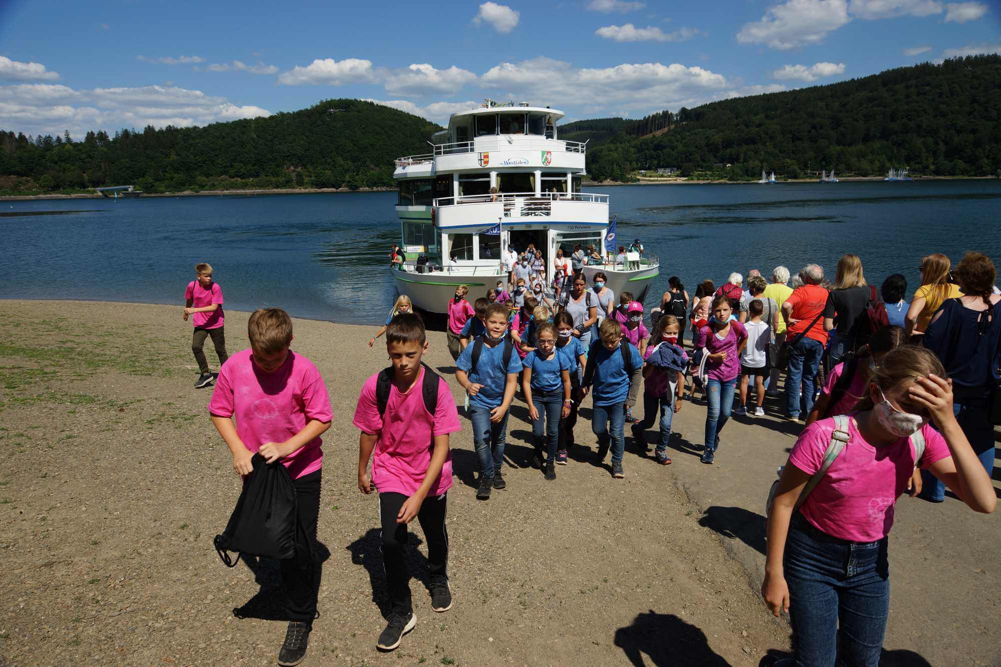 Ein wunderschöner Ausflugstag mit unseren neuen Batik-Shirts! Tolles Wetter! Wir waren heute in der Attahöhle, sind dann mit der Biggolino-Bahn zum Biggesee gefahren und haben dort eine wundervolle Schiffsrundfahrt auf dem See gemacht. Pünktlich zum Tagesausflug ist heute Pater Cyril aus Reken bei uns angekommen. Bei der Wanderung zum Aussichtspunkt „Biggeblick“ mussten wir einen sehr steilen Wanderweg hochkraxeln. Originalton Kind: Boah, nach diesem Stück habe ich 3 kg abgenommen, dann wiege ich nicht mehr 32 kg, sondern 29.