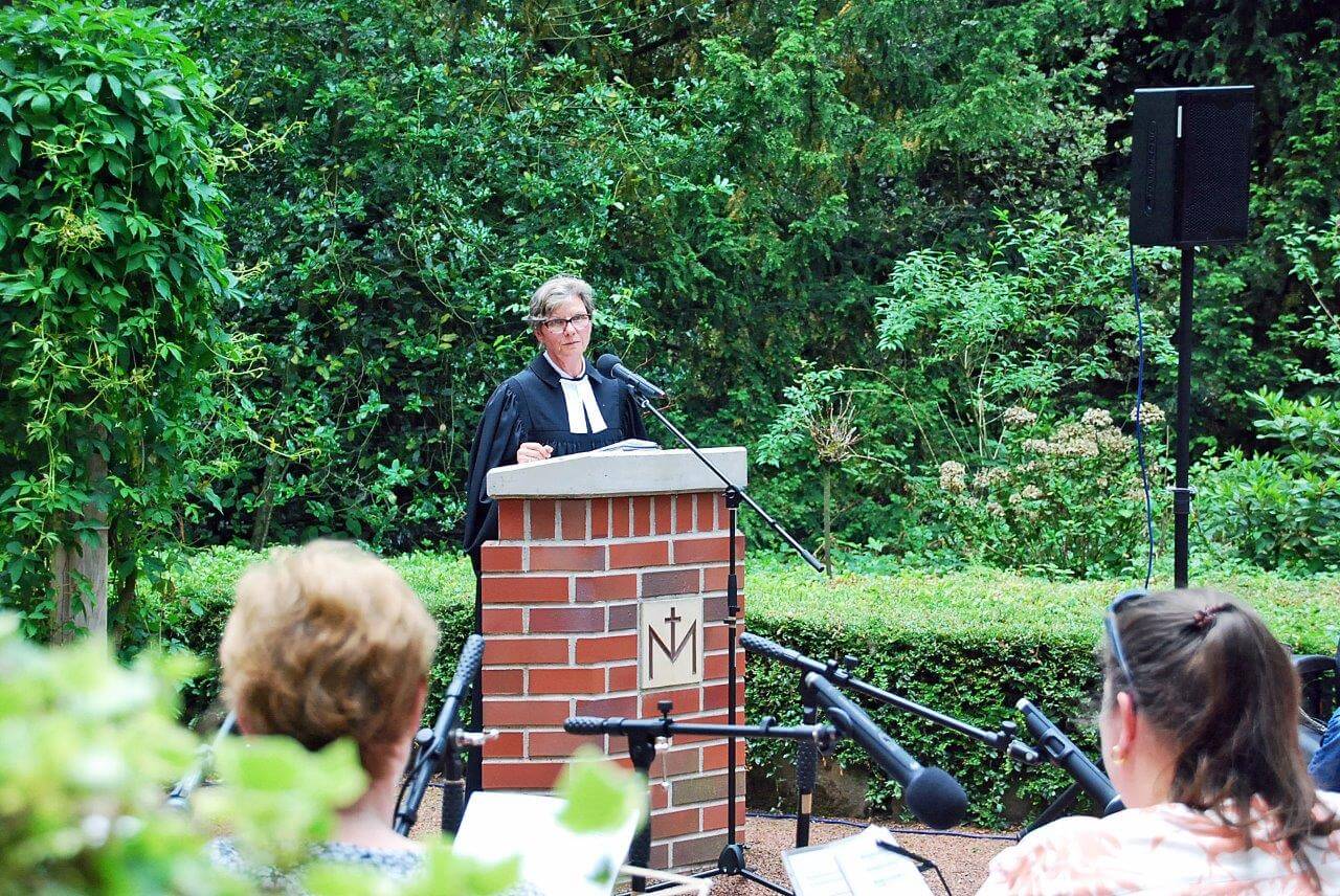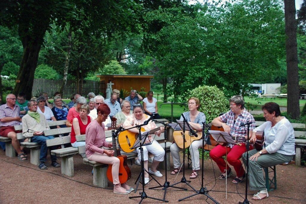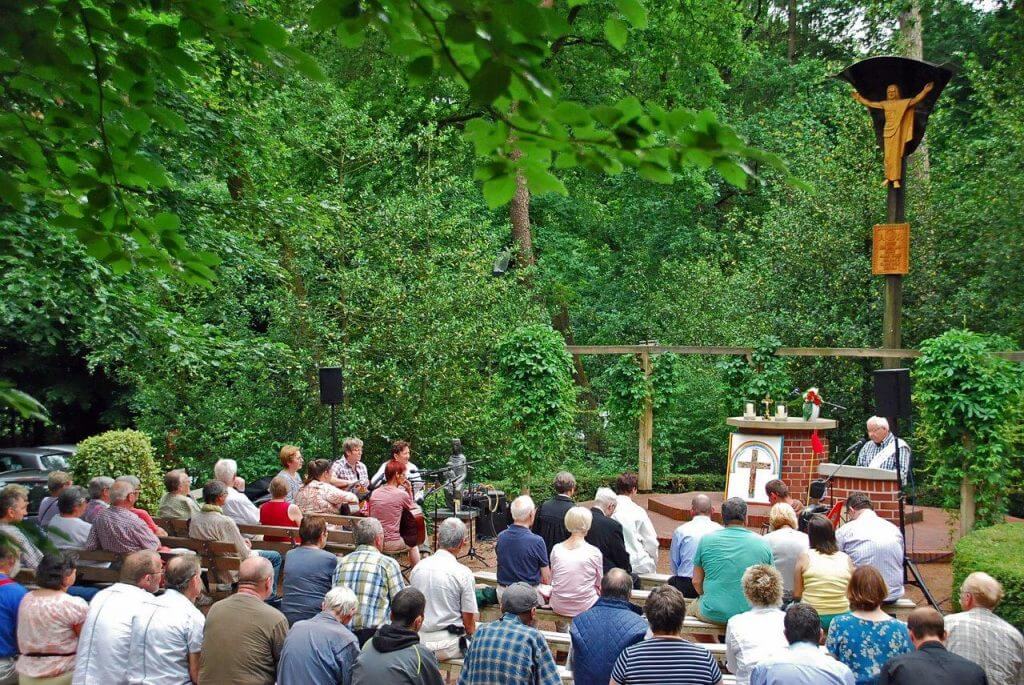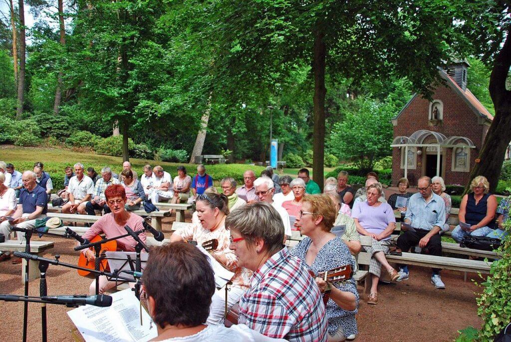 So lautete das Motto des ökumenischen Wortgottesdienstes, zu dem der Lokale Teilhabekreis am Sonntag, den 11. Juni eingeladen hat. Mit von der Partie waren die evangelische und die katholische Kirche, der Benediktushof und das Haus Maria Veen. Viele waren zur Waldkapelle gekommen. „Schau den Regenbogen an und preise seinen Schöpfer;  denn überaus schön und herrlich ist er.“ (Jesus Sirach)  Der Regenbogen entsteht, indem sich das Licht in seine Farben aufspaltet, und das geschieht nur bei gleichzeitigem Regen und Sonnenschein. So unterschiedlich die Farben, so unterschiedlich sind wir Menschen, und so hat es Gott gewollt. Dies führte Annerose Kukuk in ihrer Ansprache aus. „Regenbogen, … deine Farben sind das Leben.“ Musikalisch begleitete der Gitarrenkreis den Gottesdienst und animierte zum Mitsingen. Nach dem Gottesdienst bot das Haus Maria Veen Kaffee und Kuchen, was zum weiteren Verweilen einlud.