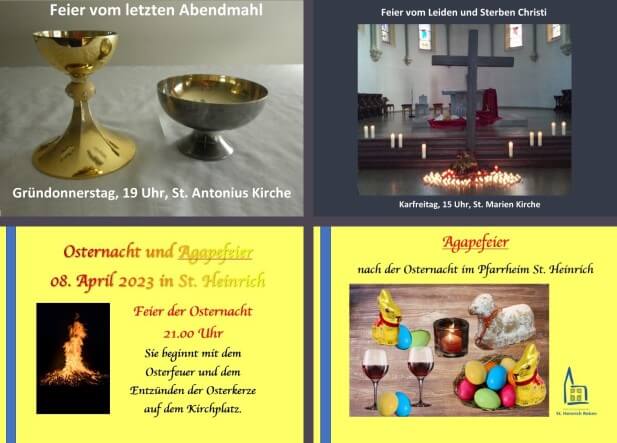 Wir laden ein zur Feier der Osternacht am Samstag um 21 Uhr in der St. Heinrich Kirche. Wir hören die Lesungen der Heilsgeschichte, die Gott mit den Menschen schreibt. Wenn die Glocken und Schellen erklingen und die Orgel feierlich das Gloria intoniert, dürfen wir nicht schlafen, sondern den auferstandenen Herrn feiern.