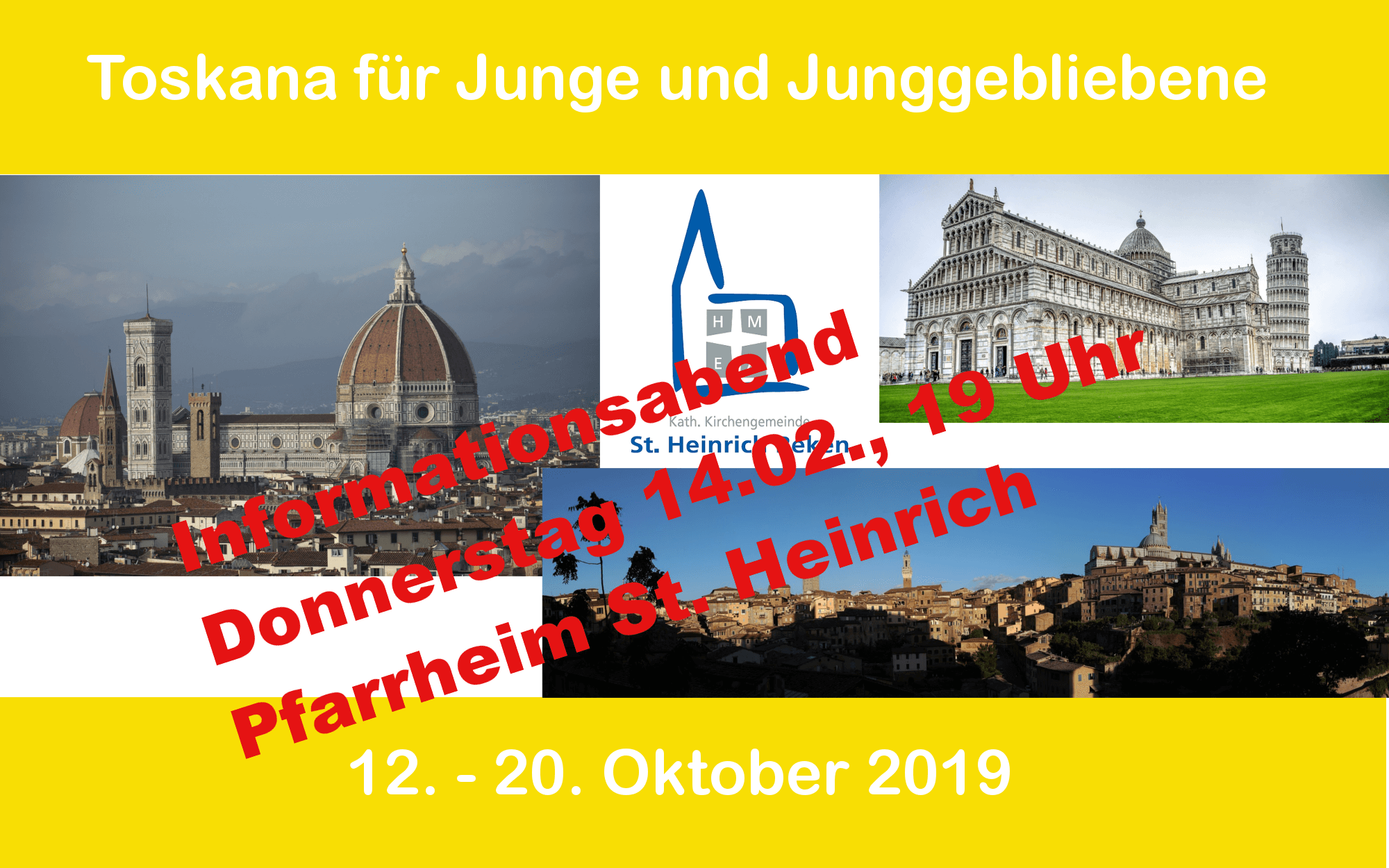 Eine buntgemischte Gruppe der Gemeinde fährt in den Herbstferien wieder nach Italien. Vom 12. – 20. Oktober plant das bewährte Team eine Tour in die Toskana. Das Hotel liegt in Montecatini Terme. Tagesausflüge nach Florenz, Pisa, Lucca, Siena, San Gimignano und Viareggio sind vorgesehen. Der Teilnehmerbeitrag wird zwischen 500 € und 600 € liegen.