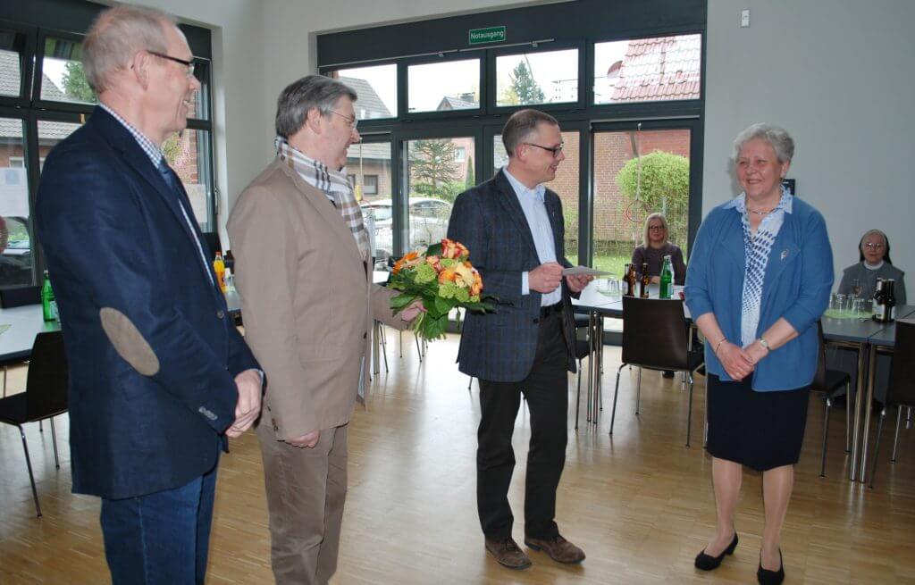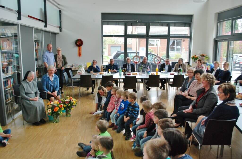 Neben ihrer Familie waren das Seelsorgeteam, die Mitarbeiter und einige Ehrenamtliche gekommen. Auch Sr. Gunthilde kam aus Münster. Für Ingrid Timmer und sie hatten der Kindergarten St. Antonius und Stephan Lemanski einen Blumenstrauß aus bunten Blumen, Liedern und einem kleinen Theaterstück vorbereitet.